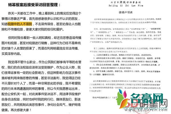 事件发生后杨幂方的工作人员就迅速作出回应,否认视频中的女孩是杨幂,嘉行杨幂工作室更是晒出律师函表示:“近日有不良媒体及个人在微信、微博、网站及平面媒体等平台上,编造发布以“杨幂醉酒被下药”、 “杨幂醉酒视频”等为标题的虚假信息、图片及恶俗视频,并大肆传播。对此工作室声明:此信息完全为虚假捏造,已对杨幂名誉造成严重损害。请相关人士立刻删除虚假信息,否则工作室将进一步追究相关法律责任。”