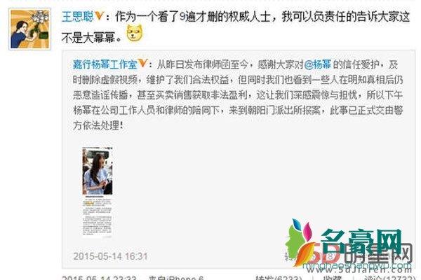 工作室出来回应后,没想到有着“国民老公”之称的王思聪也会出来力挺杨幂,他转发工作室的声明微博称:“最为一个看了9遍才删的权威人士,我可以负责任的告诉大家这不是大幂幂。”合着王思聪还把视频看了那么多遍啊,感觉他说的确实是真的,视频里面的人真的不是杨幂,大家如果通过照片仔细对比的话还是能看出来差别的,杨幂身上可没有视频中女子露出来的痣。