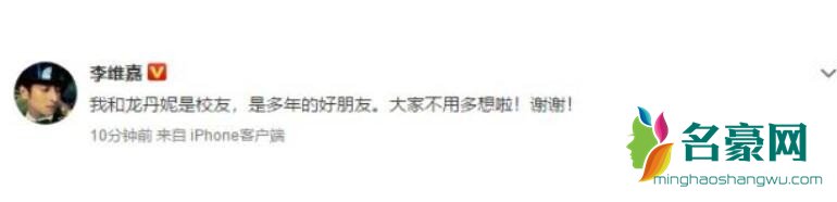 近日,李维嘉在社交平台上为这件事情做出了回应,李维嘉发文澄清了自己与龙丹妮的关系,李维嘉发文表示:“我和龙丹妮是校友,是多年的好朋友,大家不用想了,谢谢”。原来是乌龙一场,白让粉丝们空欢喜一场了。