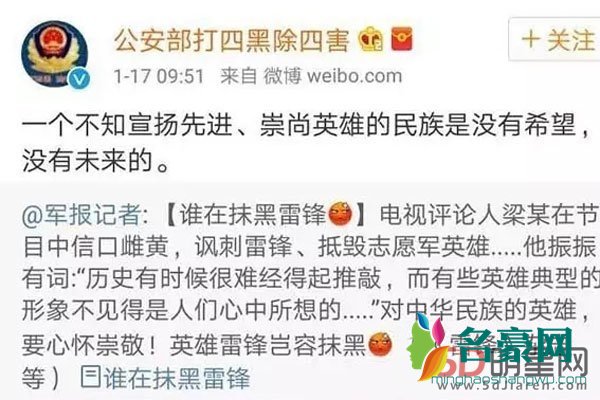 梁宏达是著名的电视主持人,他在很多的节目里面都做过嘉宾席,老梁说事是有关他的出版书籍,他在电视上总是侃侃而谈,民众都很喜欢听他讲故事或是评论社会现象,不过去年的某天,他在节目里面公然批评雷锋、焦裕禄等中国精神榜样人物,引起了群众的不满,尤其是军部和公安部,他们言辞犀利的指出了梁宏达的不当言论,并指出一个民族如果没有英雄榜样是非常可怕的。