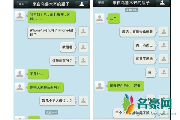 随后上海的男性网友称自己目前在上海上班,只是现在在乌鲁木齐出差,过几天回去。乌鲁木齐女网友还问了他有什么车,男性网友称是奥迪A6,并且市区还有几套自己名下的房子。两人还互发照片确认身份,乌鲁木齐女网友表示自己急需要钱,所以需要明天就要见面。而男子表示自己一个月零花钱至少十万,女孩表示自己要白色苹果4手机,男子还很豪爽的表示给她更高级的苹果4S,并且还问她想要什么自己都能满足,听起来确实是个十足的富豪。之后两人的聊天内容也是非常的不堪入目,令人无法直视。但是事情的最后也并没有在网上有详细报道,但是两人的聊天对话也不知道为什么就被曝光于网络上了。
