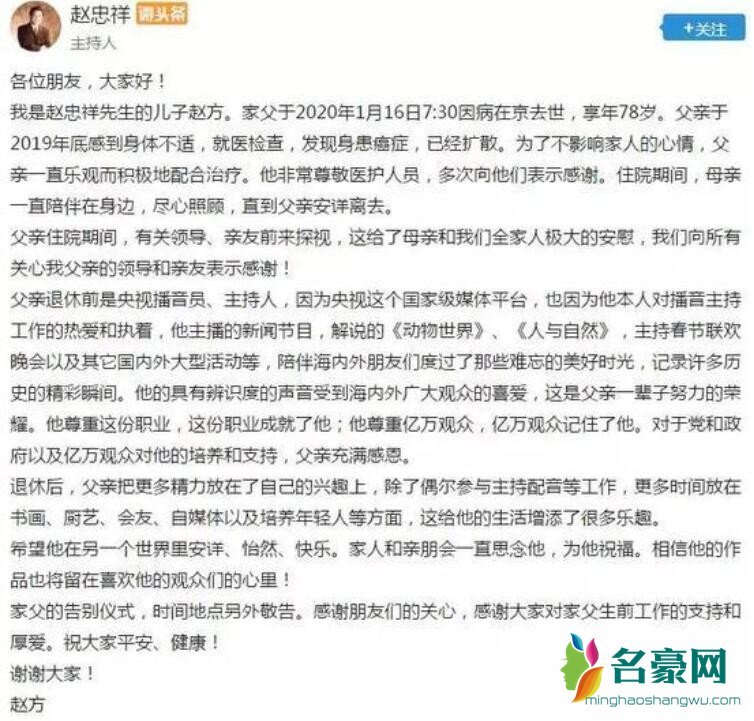 近日,赵忠祥儿子通过赵忠祥头条号更新了一条动态,赵忠祥儿子发文宣布了赵忠祥于2020年1月16日7:30因病在京去世,享年78岁。赵忠祥于2019年底感到身体不适,就医检查,发现身患癌症,已经扩散。