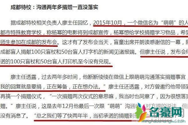 2018年初,成都校方和李萌失去了联系,无奈之下,学校的领导联系了当地媒体,成都媒体曝光了这件事情以后,杨幂诈捐门事件爆发,舆论一边倒的声讨这位大明星,杨幂知道这个事情以后,发文表示震惊,说自己也是刚知道捐赠物没有送达到学校,还一位李萌早就已经办妥了这件事情,于是自己掏腰包花了近50万的价格购买齐盲杖和盲人打字机,网友评论承诺了请对现不能欺骗受助的人。