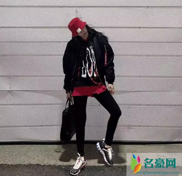 大胆地演绎红黑色经典型格配色,并以黑色打底裤突显修长美腿,红色渔夫帽亦是潮人必备单品