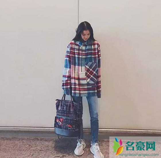 格纹元素也经常出现在欧阳娜娜身上,加上一顶帽子,颇有日系感。当然格纹裤更不能少,黑色上衣和红色小包来搭配,充满英伦学院风