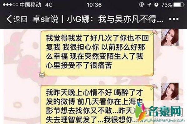 网名昵称是小g娜的一位美眉,她自称是吴亦凡的女朋友,之前和吴亦凡失去了联系,对方没有跟自己有任何的交代玩失踪,无奈之下,她把自己和吴亦凡的聊天记录曝光出来,目的就是希望吴亦凡能够主动出来和自己谈谈。事情发生以后,网友们都感到十分的震惊,原来小鲜肉偷偷地谈了女朋友!现在居然还玩起了失踪!这则消息瞬间吸引了大批围观者。