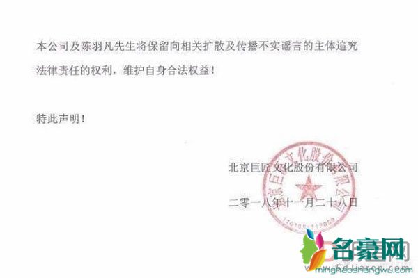 陈羽凡所在的公司北京居间文化股份有限公司在发出辟谣声明以后,到了今天的时候,官方的通告出现,警方在网络上公布了歌手陈某吸毒被捕的消息,期间公布的年龄和陈羽凡的个人资料完全吻合,于是陈羽凡吸毒被捕的消息被坐实,事情到了这个地步,北京巨匠文化有限公司似乎也感到无法在遮掩下去,于是就撤销了之前的辟谣声明,陈羽凡算是载了。
