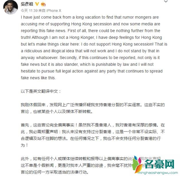 8月21日,吴彦祖在微博上发文怒斥谣言,声称:“我刚休假回来,发现网上广泛传播怀疑我支持香港分裂的不实谣言。这些不实的言论,也被某些个人以及媒体不断转载!”