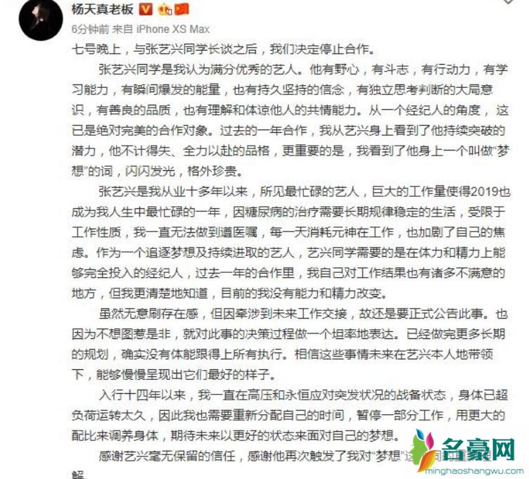 但是由于目前自己没有能力和精力再继续陪伴在张艺兴身边了,因此经过与张艺兴长谈之后,决定与张艺兴解约。随后,张艺兴也转发了微博,并且留言道:“谢谢你,胖杨,照顾好身体,照顾好自己。”
