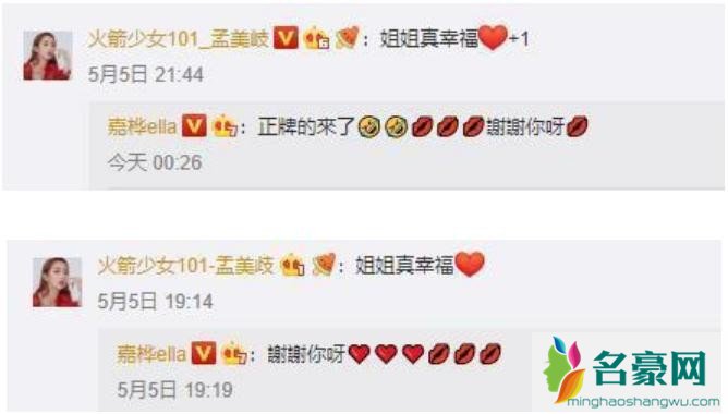 而随后,孟美歧本尊也在微博上送上了祝福。孟美歧留言到:“姐姐真幸福+1”。用巧妙的方式避免了陈嘉桦尴尬。陈嘉桦分辨出来后,回复道:“正牌来了,谢谢你呀”,让网友们哭笑不得。
