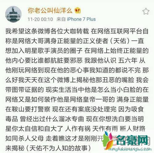 MC仙洋是黑龙江佳木斯人,实力麦手。并且非常的真实不做作,他并不掩饰他出身农村,没有钱,但是自己在努力的为了自己的理想和梦想在奋斗与拼搏。并且他也做到了,后来挣了钱还给父亲买车了。他是个非常有影响力的人,在快手上收了不少徒第,捧红了许多网红,带谁谁火的节奏。徒弟的粉丝都比他的多。就是现在快手上最火的MC天佑,吴迪,高迪,耀阳,奥利给,方丈等等都是他带出来的。而仙洋由于被爆成名之前属于网黑,吸毒打架、在警察局有前科。并且在一次直播中被一网红激怒后对骂,事件升级到约架,造成很大的负面影响,所以快手号被永久封存了,这对他造成了不小的影响。他曾经收了五个徒弟,号称“仙家五虎”,但是后来KK、骡子、大振接二连三的离开了他。而自己一手创办的七兄弟也解散了,有的还和他彻底闹翻了。最有名的就是仙洋和天佑、牌牌琦等和仙洋也曾经是闹到水火不容的地步。