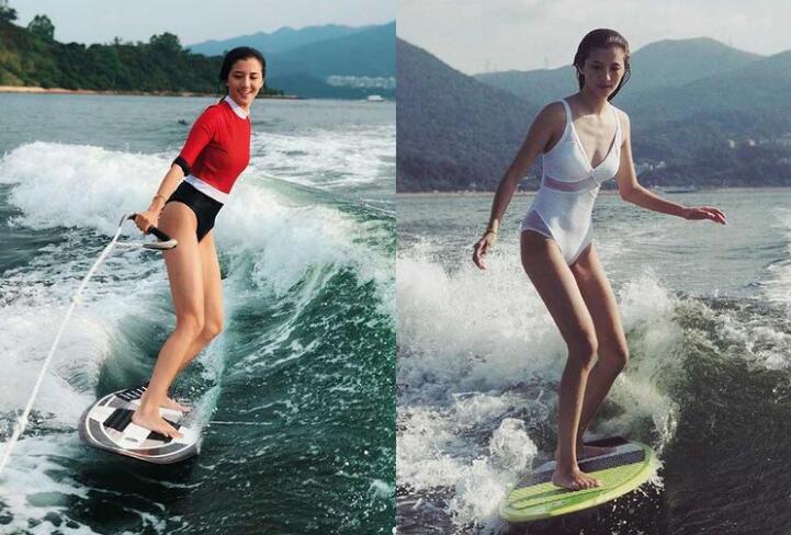 今年吴千语伙拍关智斌一同出海玩Wakesurf,技术进步了,上板手到拿来。