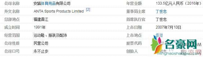 安踏体育用品有限公司 (港交所:2020),简称安踏体育、安踏,是中国领先的体育用品企业,主要从事设计、开发、制造和行销安踏品牌的体育用品,包括运动鞋、服装及配饰。