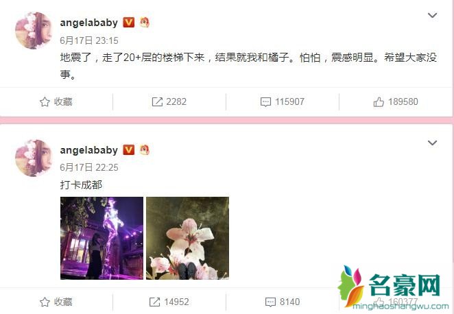 在6月17日晚上23点15分的时候,Angelababy在微博上发文庆幸自己“劫后余生”:“地震了,走了20+层的楼梯下来,结果就我和橘子。怕怕,震感明显。希望大家没事。”