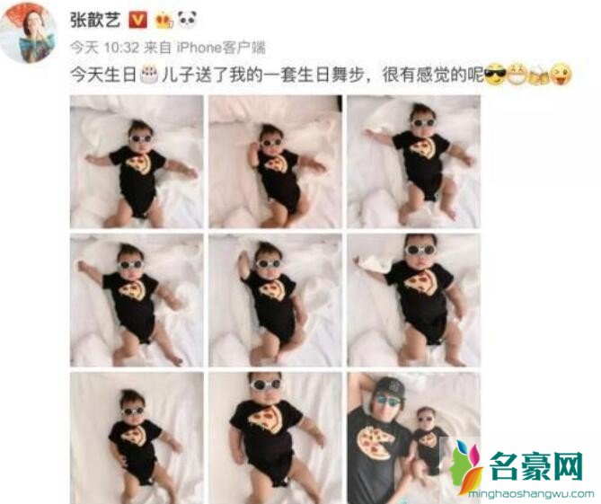 近日,张歆艺在社交平台上晒出了9张儿子的照片,并且配文表示:“今天生日,儿子送了我的一套生日舞步,很有感觉的呢!”照片中,宝宝带着墨镜在床上手舞足蹈,做出各种各样的动作,胖嘟嘟的身体看起来实在太可爱了。