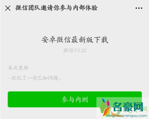 微信7.0.22内测版一般需要微信团队推送邀请参与内测的页面,才能体验到新版。如果没有被邀请内测的,可以试试从下面的地址下载。