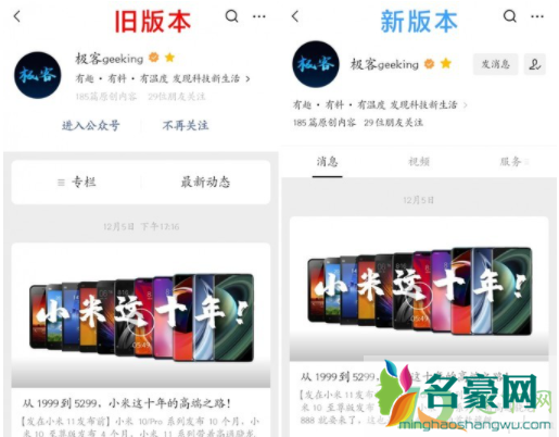 新版本公众号主页取消【进入公众号】【不再关注】入口,Logo和名称右侧位置则新增“发消息”和“取消关注”按钮。