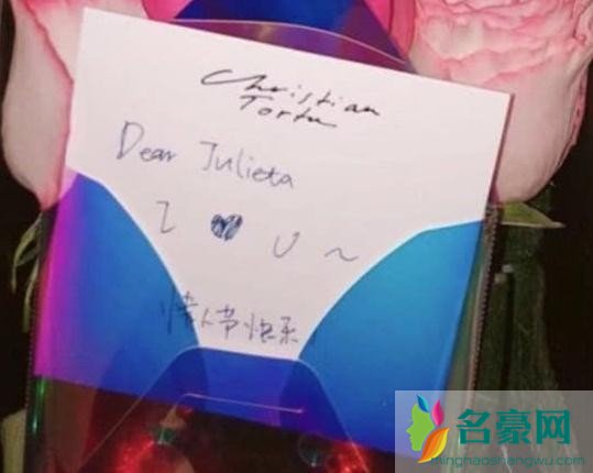 从照片中可以看出来,蒋劲夫送给乌拉圭女友的礼物很是用心,因为上面还有一张蒋劲夫手写的卡片。而卡片上先用英文写着:“DearJulieta,IloveU”,随后有用中文写上“情人节快乐”的字样。