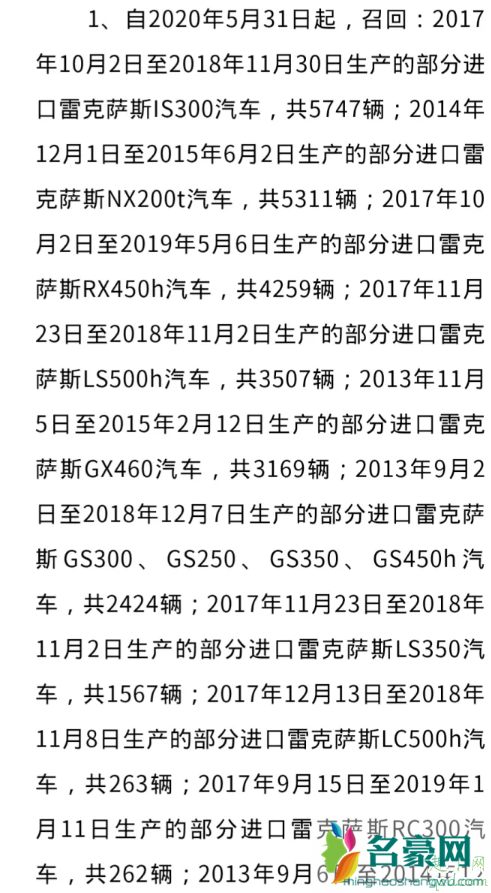 丰田中国(共59982辆)雷克萨斯IS300、NX200t、LS500h、GX460、RX450h、GS300、GS250、GS350、GS450h、LS350、LC500h、RC300、LS460L、LS600hL、RX300、LX570、丰田埃尔法、丰田FJ酷路泽汽车