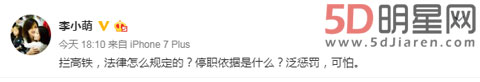 近日永红路小学教师罗海丽拦高铁门的事件还在持续发酵中,在合肥到广州的G1747次高铁列车上她以等老公为理由用身体强行阻拦车门关闭,并提出让检票员放行的要求,之后安徽合肥庐阳区教体局对该女子做出了停职检查处理的决定,该女子不服在网上发出质问:“学校凭什么让我停职?我教学又没过错”,网友们也纷纷对她的行为做出了讨论,而媒体人李小萌却为拦高铁女子鸣不平,称:“拦高铁,法律怎么规定的?停职依据是什么?泛惩罚,可怕。 ”
