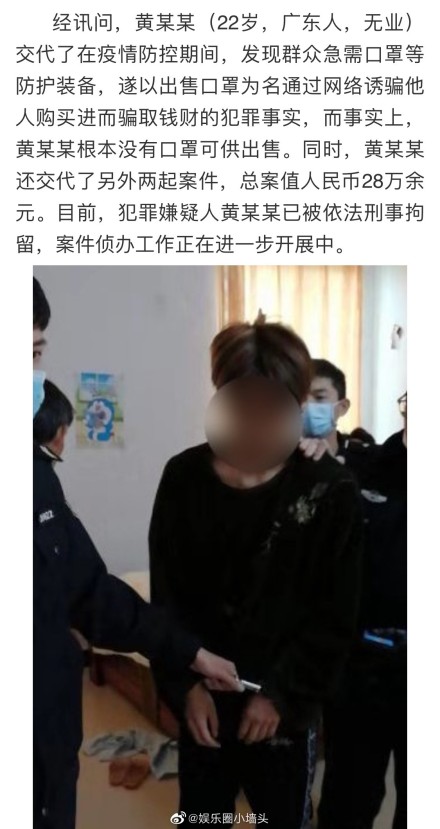 经讯问,黄某某(22岁,广东人,无业)交代了在疫情防控期间,发现群众急需口罩等防护装备,遂以出售口罩为名通过网络诱骗他人购买进而骗取钱财的犯罪事实,而事实上,黄某某根本没有口罩可供出售。