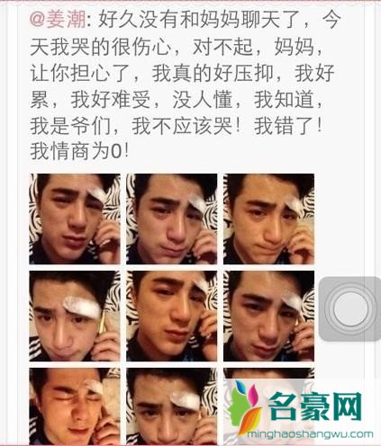 9月4日,在全新播出的综艺节目《新生日记》中,姜潮首次回应了自己在微博上分享的九连拍哭照。姜潮表示当时由于下雨天加上自己眼睛受伤了,在和妈妈聊天的过程中哭了出来,突然觉得自己很帅就拍摄了下来。