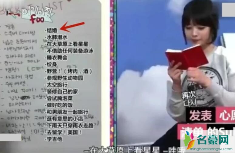 近日,有网友扒出了雪莉在早年录制综艺节目的片段,在节目中,雪莉和f(x)的团员被要求写下死之前要做什么的遗愿清单,雪莉的遗愿清单的愿望足足有17个,第一个愿望就是结婚。