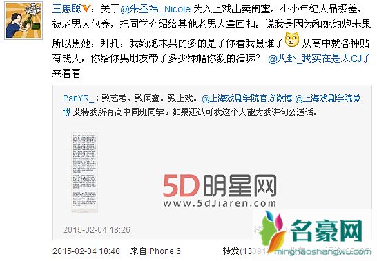 王思聪在微博上爆料,称朱圣祎:“小小年纪人品极差,被老男人包养,把同学介绍给其他老男人拿回扣。说我是因为和她约炮未果所以黑她,拜托,我约炮未果的多的是了你看我黑谁了从高中就各种贴有钱人,你给你男朋友带了多少绿帽你数的清嘛?”对此看热闹的网友们也各执一词,不过大多数人表示支持“老公”,也有一部分人表示:“我只想静静地看着你们这群有钱人聊天。”