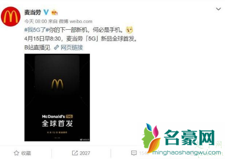 4月13日早上,麦当劳官方微信公众号发布消息称,将于4月15日举行“5G”新品云发布会,从其slogan可以看出,这次可能会发布一款5G新品。