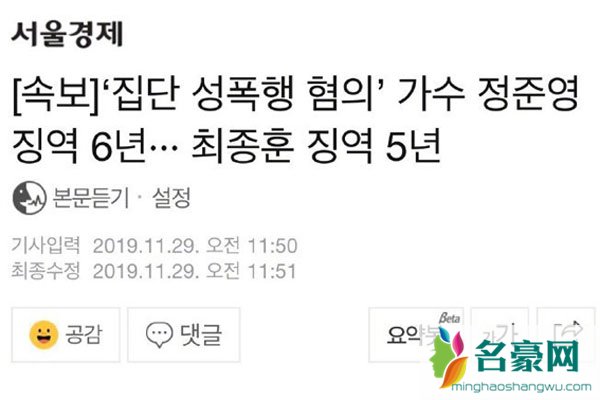11月29日,郑俊英等人的判决结果出炉。据韩国媒体报道,首尔中央地方法院今天开庭对郑俊英,崔钟勋集体性侵,非法偷拍散布视频案进行了一审宣判,郑俊英因参与集体性侵并偷拍散布视频而被判处有期徒刑六年,崔钟勋则因参与集体性侵而被判处有期徒刑五年,少女时代成员权俞利(Yuri)的哥哥权赫俊判刑则被判了四年,原来除了郑俊英之外还有两个人也犯了罪。