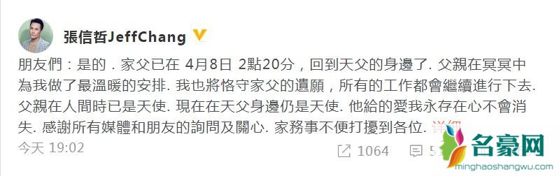 4月16日,张信哲在微博发表了新动态,证实了之前网友对于张信哲父亲的猜测。当天,张信哲在微博上称:是的,家父已在4月8日2点20分回到天父的身边了。父亲在冥冥中为我做了最温暖的安排,我也将恪守家父的遗愿,所有的工作都会继续进行下去。