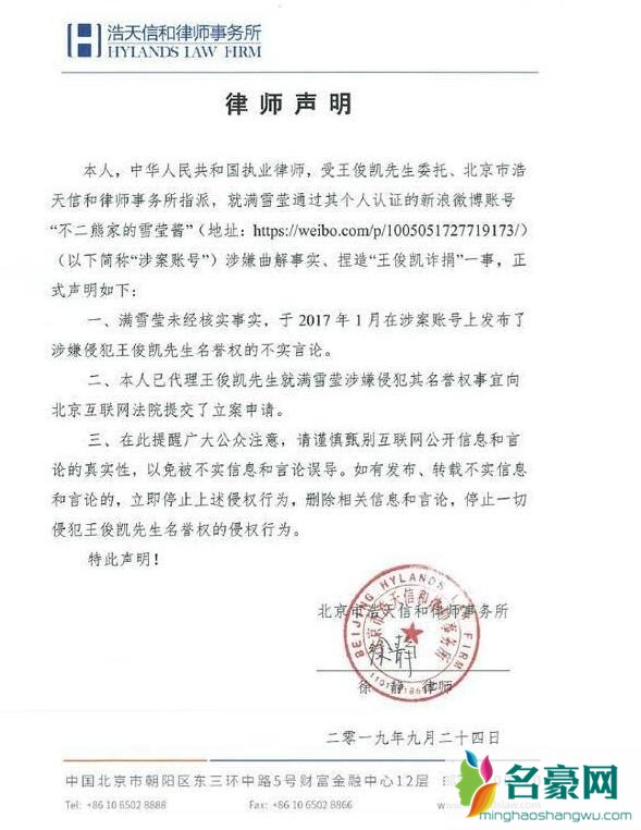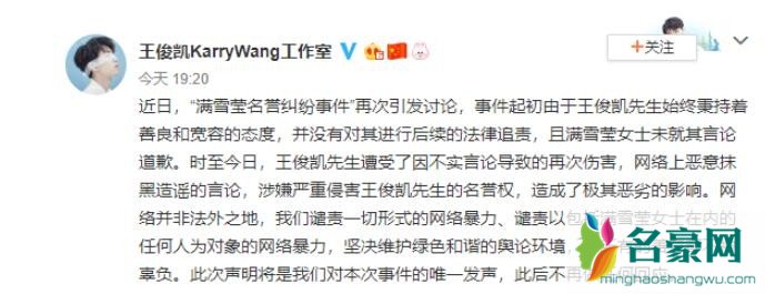 同时王俊凯工作室还强调恶意抹黑造谣的言论,这些造谣言论对王俊凯对此造成了伤害,但信息发布者满雪莹未就其言论道歉,随后有王俊凯粉丝因此事而去骂了满雪莹,于是被其反告王俊凯粉丝侵犯她的个人名誉权。