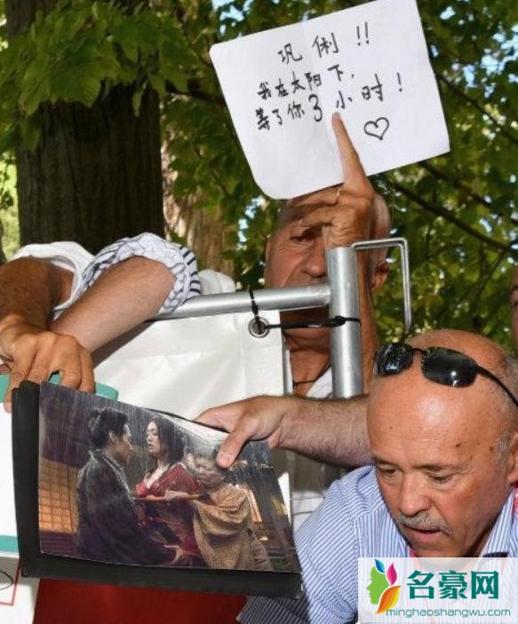当天在威尼斯电影节举行发布会上,有着一群大叔等待着巩俐的到来,其中一个大叔在一张白纸上面用中文写道:“巩俐!!我在太阳下,等了你3小时!”并且还画出了一个心形表情。