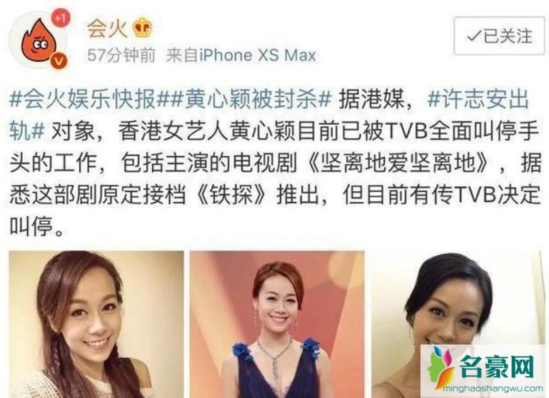 在4月16日晚上7点,许志安召开了记者会,承认了出轨。但是作为出轨女主的黄心颖至今还没有任何回应。不过网上也传出了黄心颖被tvb全面封杀的消息,因为tvb对于艺人丑闻一直都是零容忍态度。