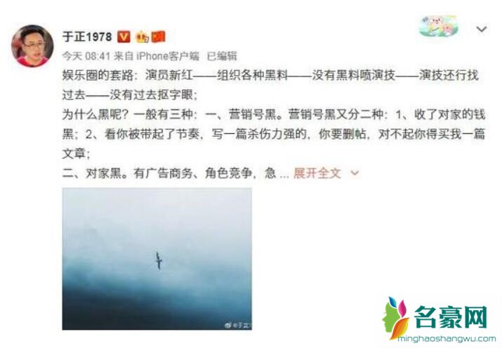 近日,于正在社交平台上更新了一条动态,于正发布了一篇长文谈到了娱乐圈的套路分为:演员新红、组织各种黑料、没有黑料喷演技、演技还行找过去、没有过去抠字眼这五步。