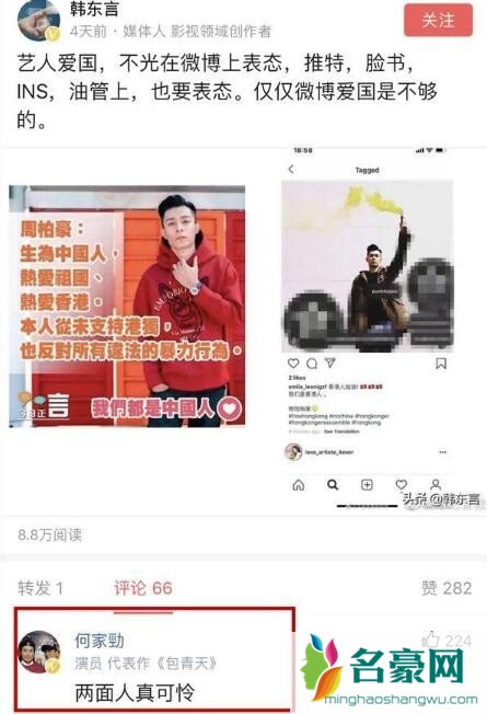 近日,有网友在网上发布了一条谴责周柏豪的动态,网友发文表示:“仅仅微博爱国是不够的”,应该“推特、脸书、INS、YouTube”等平台全面“开花”。这条动态发布出来以后,著名演员何家劲为此做出了评论。