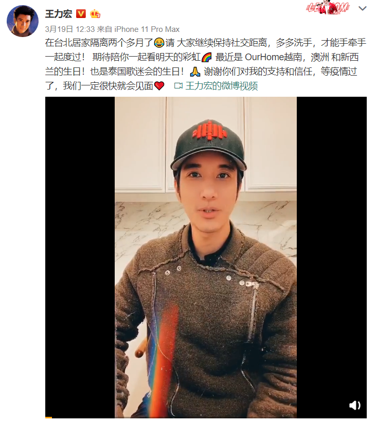 他在视频中表示,近期他一直乖乖地待在家里自我隔离,足不出户,每天几乎都在看书、看电影、运动、练琴、听音乐及陪伴家人,是让他“自我丰富”的时间。他还表示:“等疫情过后再重新出发。”他也同时呼吁大家“继续保持社交距离,多多洗手,才能手牵手一起度过! 期待陪你一起看明天的彩虹。”