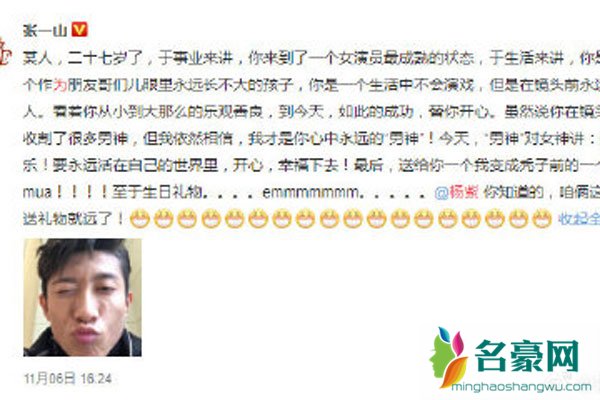 张一山在微博中说:“某人,二十七岁了,于事业来讲,你来到了一个女演员最成熟的状态,于生活来讲,你是我这个作为朋友哥们儿眼里永远长不大的孩子,你是一个生活中不会演戏,但是在镜头前永远真诚的人。看着你从小到大那么的乐观善良,到今天,如此的成功,替你开心。虽然说你在镜头前已经收割了很多男神,但我依然相信,我才是你心中永远的“男神”!今天,“男神”对女神讲:生日快乐!要永远活在自己的世界里,开心,幸福下去!最后,送给你一个我变成秃子前的一个大大的mua!!!!至于生日礼物。。。。emmmmmmm。。。。。”