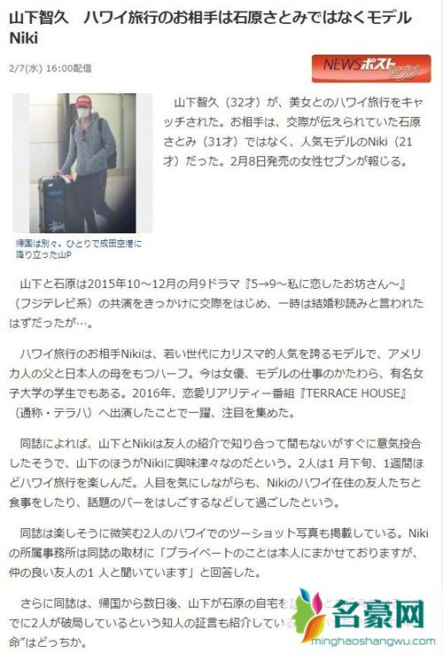 据了解山下智久与女模Niki是通过共同的朋友介绍认识,一见如故的二人相处的非常好,所以在1月下旬就相约一起去夏威夷游玩一周,但是此前山下智久和石原里美合作《朝五晚九》后被传热恋,两人互相到对方家中参加派对,也被拍到两人陪伴庆生,去年更是传出闪婚的消息,然而最后二人还是分了手,据悉分手原因是聚少离多,但究竟是不是聚少离多恐怕只有当事人心里最清楚,对此女方事务所回应:“私事交由艺人自己处理,听说他们只是关系好的朋友。”
