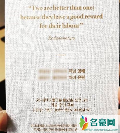 1月25日,韩国歌手宋栢京晒出太阳和闵孝琳的结婚请柬,看到请柬大家是不是才发觉距离二人结婚的日子越来越近了?照片上的请柬婚礼邀请函以白纯色调为主,封面用红、白花点缀,华丽又不失典雅,白纯色调象征“永恒纯洁的爱”,内容取自《传道书4:9》里的句子,写着:“两人总比一人好, 因为二人劳碌同得美好的果效。”新郎栏写着太阳本名“永裴”,新娘栏则是闵孝琳的本名“恩兰”,估计好多网友直到现在才知道他们的本名吧。