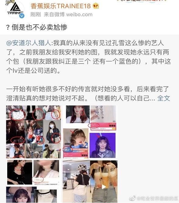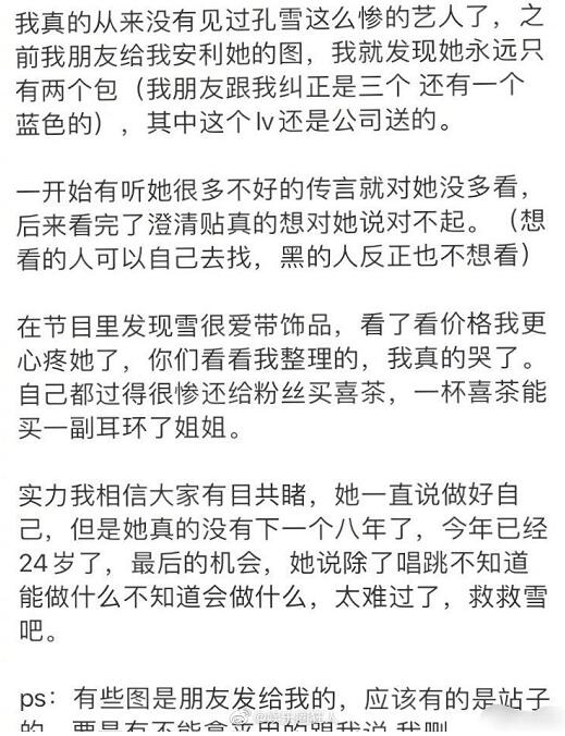 孔雪儿惨吗?当然惨!她惨在271舞台属于她的part不给她镜头,惨在热点人物排名却在第九,惨在黑料无数却个个都是造谣,惨在路人愿意看澄清的不多跟风无力黑。她不是惨在穷‼️不要再给她舞穷的人设了。