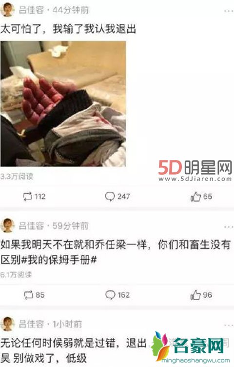最近吕佳容正在拍摄的《我的保姆手册》领誉传媒属于出品方之一,吕佳容听上去似乎是受到了某种胁迫,称:“如果我明天不在就和乔任梁一样,你们和畜生没有区别”,之后更晒出被鲜血染红的手腕,称:“太可怕了,我输了我认我退出”。吕佳容由于拍戏总和男主角传出绯闻,比如搭档的陈伟霆和韩东君等,所以路人缘也不怎么好,加上年初李小璐出事的时候别人都不说话就她出来力挺,在被人评价为“好闺蜜”的同时也被酸了一把。