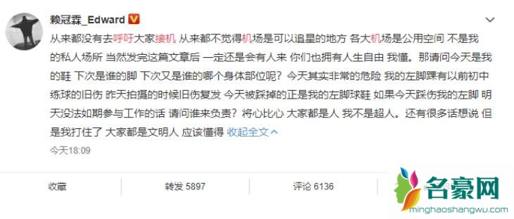 近日,赖冠霖在微博上发文呼吁粉丝们不要接机,声称:“从来都没有去呼吁大家接机,从来都不觉得机场是可以追星的地方,各大机场是公用空间,不是我的私人场所!”