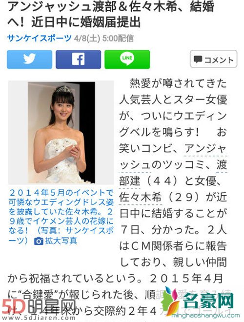 此前就有消息称,日本知名女演员佐佐木希和大她15岁的搞笑艺人渡部建即将结婚,而该消息在近日终于得到证实,双方甚至已经和广告厂商告知,将会在近期内完成结婚登记。结婚喜讯传出后,不仅在日本炸开了锅,佐佐木希全球各地的粉丝们都为此消息表现出了惊讶之意,虽说女神早就到了该结婚的年纪,能收获自己的幸福也是一件好事,但看着自己女神出嫁大家的心情还颇有些伤感呢。