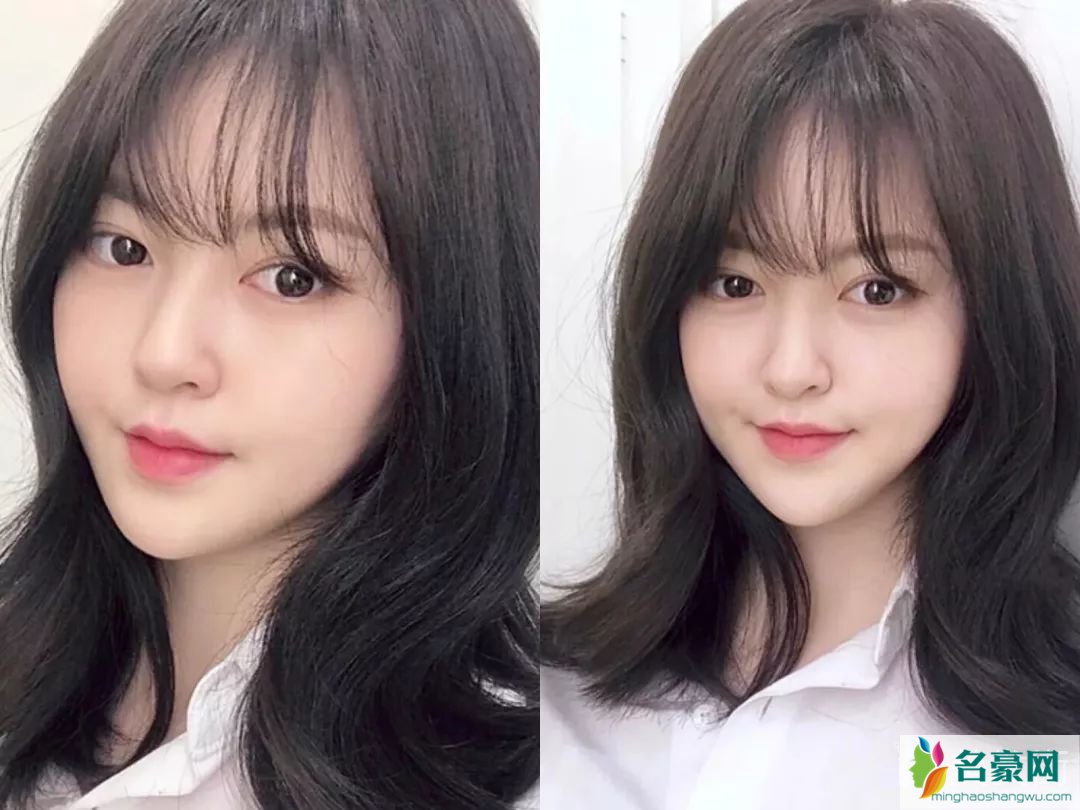 任何脸型都适合的法式刘海发型,头发是韩式蓬松气垫烫,发尾有些S型,还带些外翘感,而刘海采用的是法式的八字刘海,真的很适合大脑门、脸大的女生。头发染上时尚自然的黑茶色,肤色都白了好几度呢。