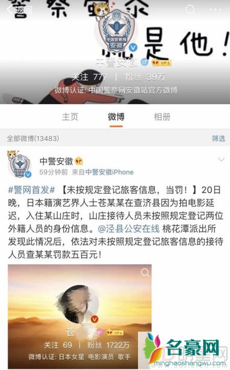 据悉,近日“中警安徽”的官方账号在微博中对外宣布,由于未按照规定对旅客信息进行登记,因此在20晚上,日本某演艺界人士在某山庄居住时造成的操作失误让该山庄接待人员受到处罚。苍某某在该县城拍电影时遭遇延迟,于是入住某山庄,但山庄接待人员为对两位外籍人员进行身份登记,因此在派出所的调查过后罚款500元。这条微博中不仅提到了苍某某,且配图当中还使用了苍井空的微博简介,虽然将其头像马赛克,但是不管是微博认证还是名字的首字来说,都能让人一眼猜出就是苍井空。