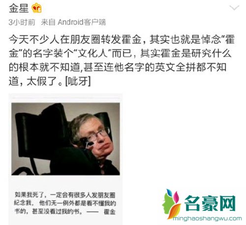 金星在今天中午发微博吐槽那些悼念霍金的人太假,她说:“今天不少人在朋友圈转发霍金,其实也就是悼念“霍金”的名字装个“文化人”而已,其实霍金是研究什么的根本就不知道,甚至连他名字的英文全拼都不知道,太假了。”最后还配了一张霍金的照片,照片上写了一段霍金说的话:“如果我死了,一定会有很多人发朋友圈纪念我,他们无一例外都是看不懂我的书的,甚至没看过我的书——霍金。”不得不说金星的这段犀利吐槽戳中了好多人的痛脚,好多人怒斥她蹭热度,但也有人觉得金星说的挺对的,明明不懂却一直在发文悼念霍金博关注,可不就是太装了么。