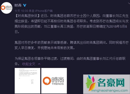 3月13日上午,时尚集团官方微博宣布他们的总裁苏芒女士因个人原因,向董事长刘江先生提出辞呈,希望即日起不再担任时尚集团各项职务。考虑到苏芒在集团成长与发展阶段做出的贡献,刘江董事长再三挽留,苏芒的离职日期确定为2018年5月8日。苏芒辞职的消息让好多网友都很惊讶,毕竟她也是为数不多的知名度超高的时尚圈内人士,所创办的芭莎慈善夜能邀请到众多大咖明星云集,可见苏芒在圈内的地位与好人缘。