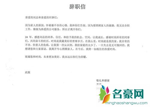 在辞职信中苏芒解释了自己辞职的原因,表示是因要照顾家人健康无法兼职工作,而时尚集团为了对苏芒多年来的贡献表示感谢,特意聘请其出任时尚集团顾问,也就是说苏芒只是辞去了时尚的总裁一职,并没有退出时尚界的意思。只是她辞职的原因被好多网友吐槽太过官方,但无论什么原因造成的苏芒离职,大家都希望她今后能在其他领域中也有好的发展,毕竟苏芒在时尚圈驰骋二十多年,辞了总裁照样能在混在时尚圈嘛。
