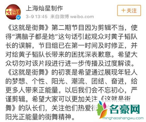 在《这就是街舞》发布的声明中,他们就剪辑不当使得“满脑子都是她”引起观众对黄子韬的误解致歉,同时也表示节目组已在第一时间修正,并对给艺人带来的困扰深表歉意,希望大众勿对该片段进行进一步传播及过度解读,随后《这就是街舞》的制作方上海灿星制作也在官微上道歉,声称以后会严谨剪辑。说来《这就是街舞》这档节目也是有毒,这才播出多长时间就整了这么多幺蛾子,节目怕不是想要黄了吧。